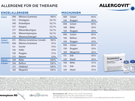 ALLERGOVIT® ist ein hypoallergenes hochdosiertes Präparat (Allergoid) für die subkutane Allergen-Immuntherapie (SCIT) bei Pollenallergien.