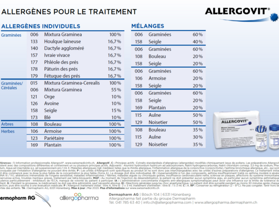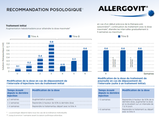 - ALLERGOVIT® Traitement pré-saisonnier court avec 7 injections. Une poursuite pré-saisonnière du traitement est possible.
